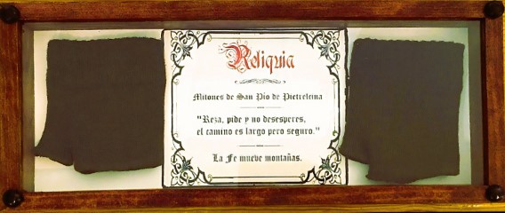 La Capilla de Padre Pío tiene el privilegio y el honor de atesorar y tener expuesta al público, una auténtica reliquia, qué perteneció y usó Padre Pío durante muchísimo tiempo. Se trata de unos MITONES qué ocultaban los estigmas, de sus benditas manos, yagas o heridas sagradas parecidas a las de Jesús en el momento de la crucifixión, éstos MITONES, son unos guantes recortados que cubrían completamente las palmas de sus santas manos dejando al descubierto sus dedos.